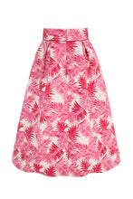 The sensational Remy Skirt, inspired by a 1950s silhouette. Re-imagined in a gorgeous Italian palm jacquard cloth. The warm stone textured back ground has hot pink palms woven within.