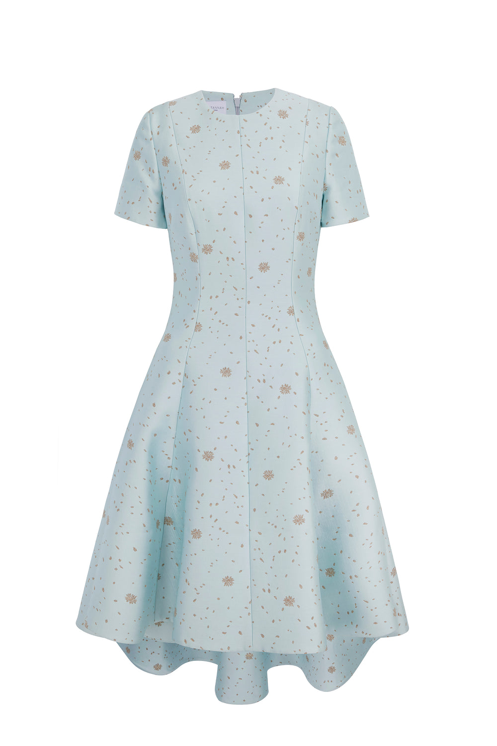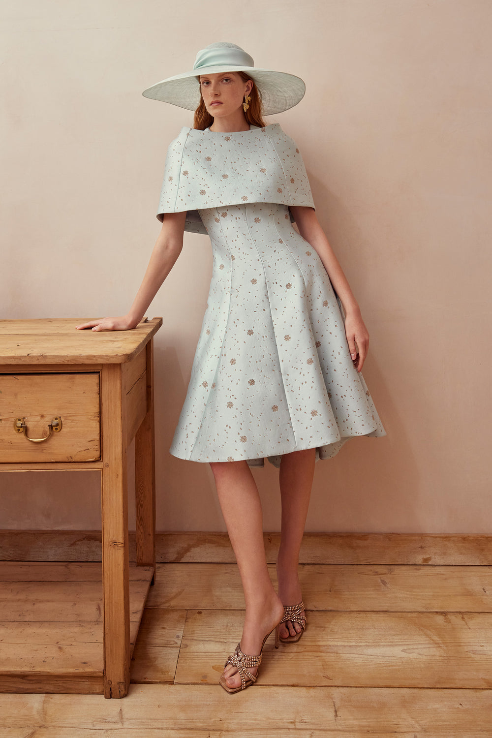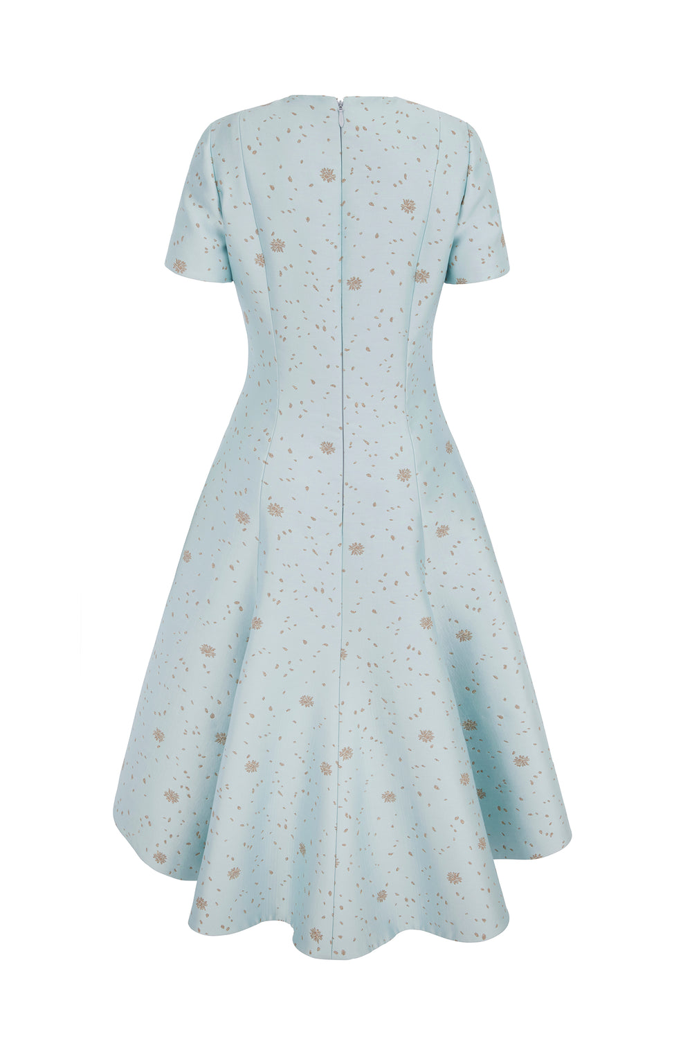 A beautifully tailored modern occasionwear outfit of dress and a separate cape, made from a high quality Italian jacquard with twinkling burnished metallic gold thread on a pretty pale topaz blue base. This is a best-selling silhouette for formal occasion wear from our collection.