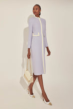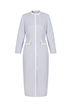 Soft blue Italian wool crepe is trimmed with bright ivory wool crepe to highlight the sophisticated clean lines of this modern immaculately made investment piece.