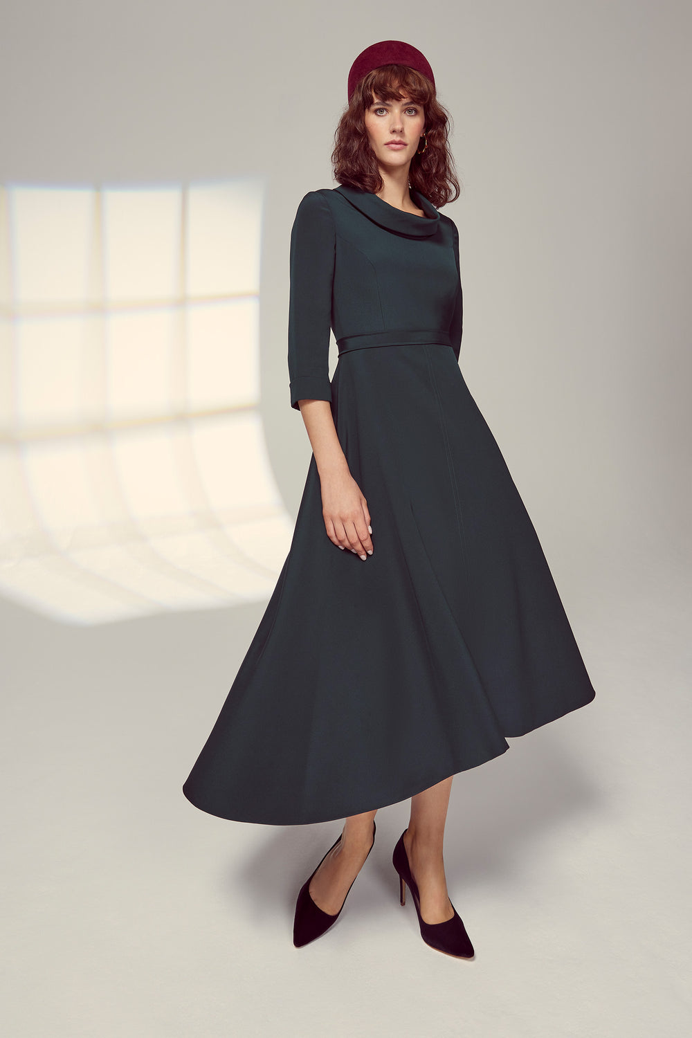 An elegant full skirted dress, the Silk Cowl Neck Riding Dress in Forest is softly tailored from our signature high quality Italian silk crepe, which has a wonderful fluidity, weight and drape.