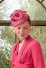 The Jitterbug is a stunning raspberry teardrop shaped cocktail hat, with structured silk trims.