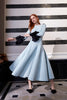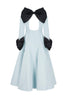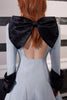 The open backed bodice is finished with a contrasting large bow made from slipper silk satin in jet black, with the bow echoed on the cuffs to add a playful touch of classic femininity.