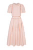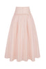 The skirt is high waisted, to ensure the midriff is covered with the top over-lapping. The skirt features hidden side seam pockets and a centre back invisible zip for step in ease and is fully lined in silk habotai. The lower waist seam is finished with a beautiful fringing detail.