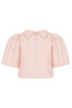 The softly-structured bodice finishes on the natural waistline, and features a high neckline with a Jackie O style collar, and a beautifully exaggerated sleeve, which creates a stunning, playful silhouette. The shoulders are finished with a beautiful fringing detail.