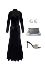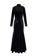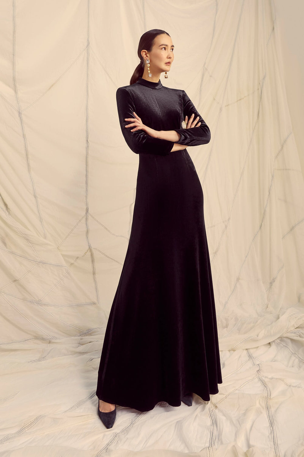 The Hemera Gown is a stunning sleek floor length gown, cut from a high quality black velvet jersey.