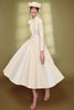 The dress has a fitted bodice with slim sleeves and an elegant stand collar which fastens with silk covered buttons.