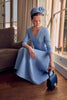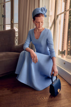 The Arlena Dress is a beautiful adaptation of our best selling fit and flare silhouette, with an ultra-flattering curved V-neck, cut from a high quality Italian stretch cloqué in a beautiful mid blue hue.