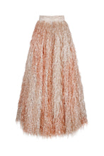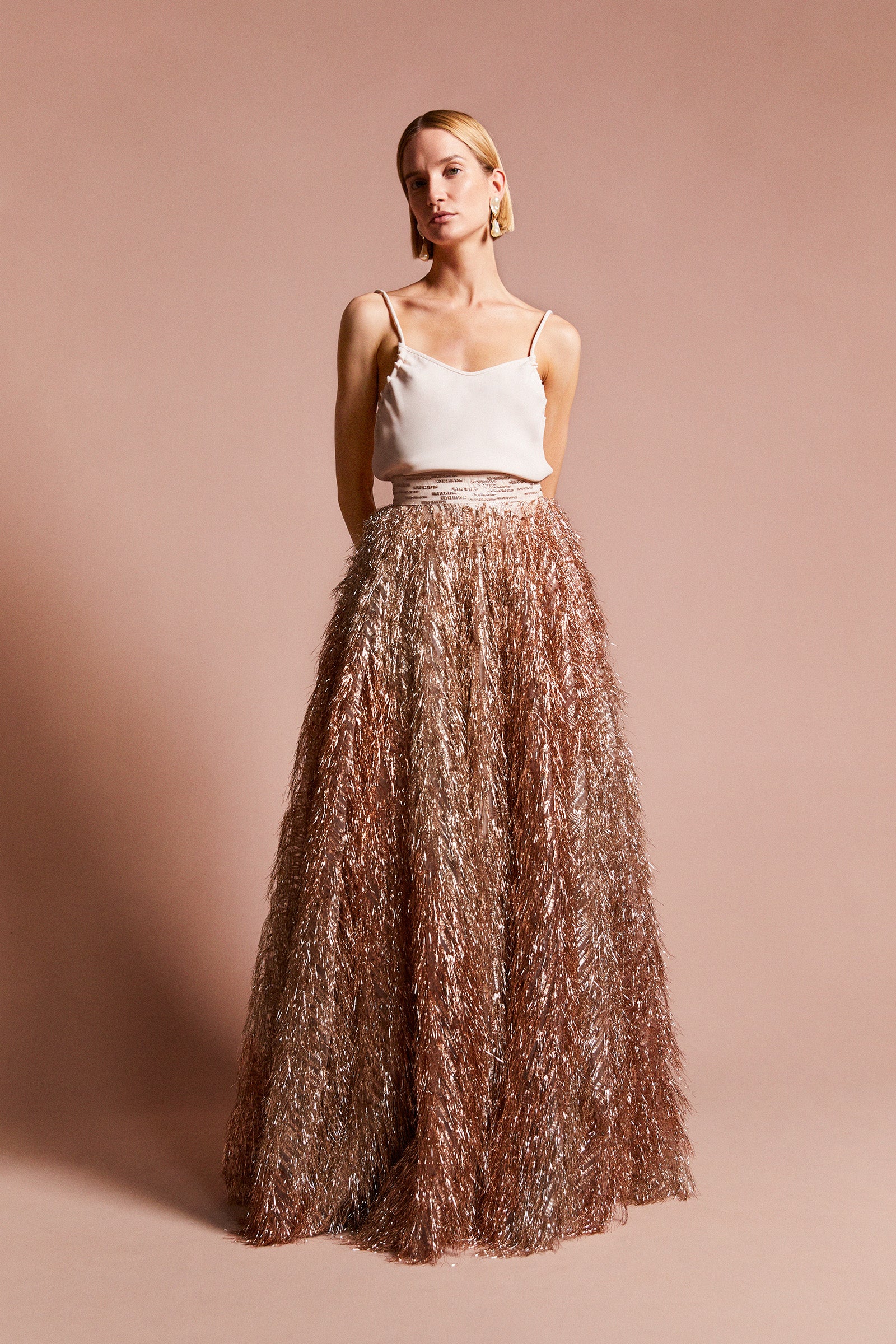 The Carnegie Skirt is a sensational floor length ball skirt cut from a stunning Italian rose gold tasselled lamé, and fully lined in silk. Truly the skirt of dreams.