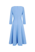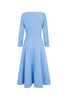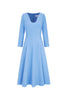 The Arlena Dress is a beautiful adaptation of our best selling fit and flare silhouette, with an ultra-flattering curved V-neck, cut from a high quality Italian stretch cloqué in a beautiful mid blue hue.