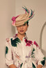 The Atrani Disc hat is a natural sinamay disc with colour-dipped bleached pheasant feathers and ombré pinokpok bow.