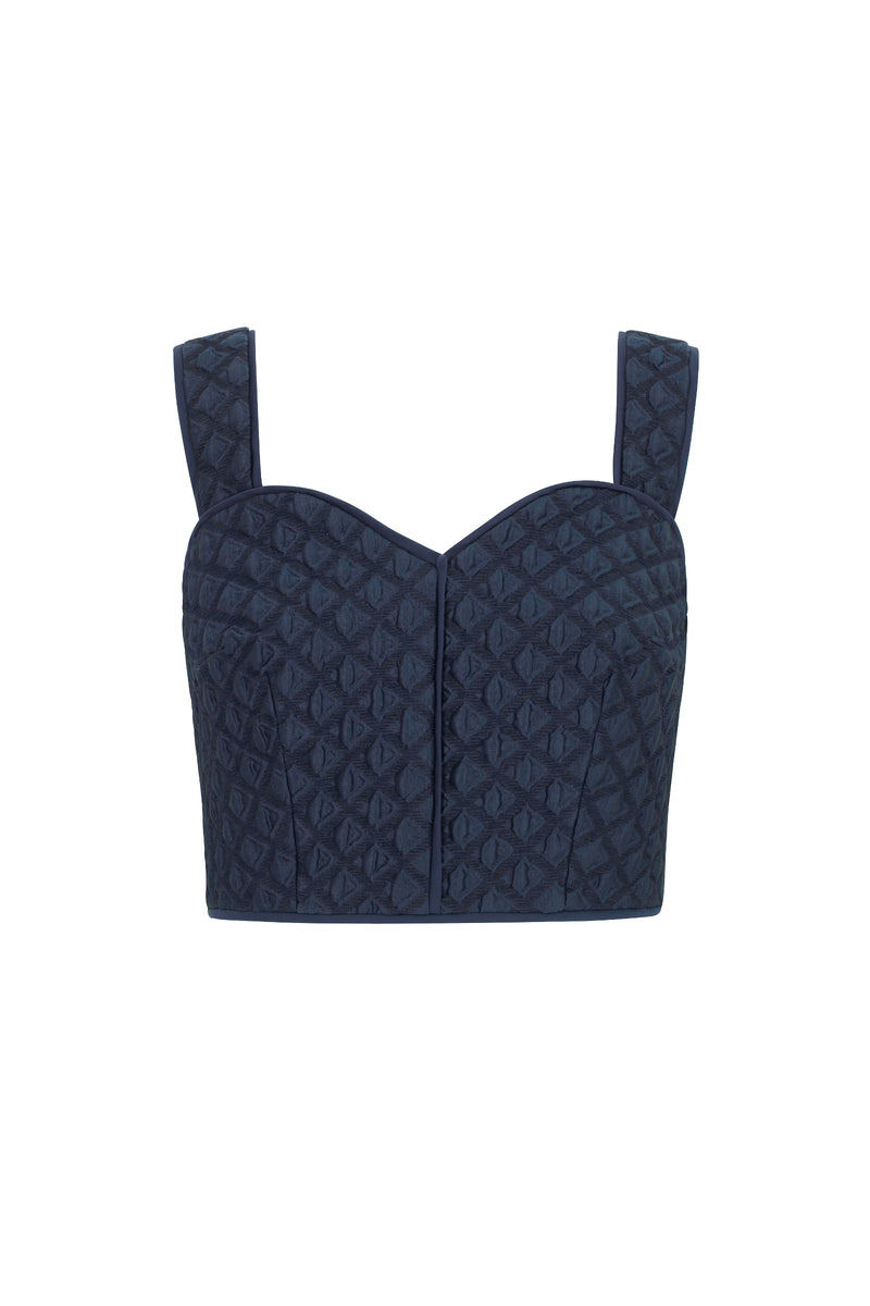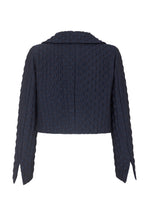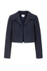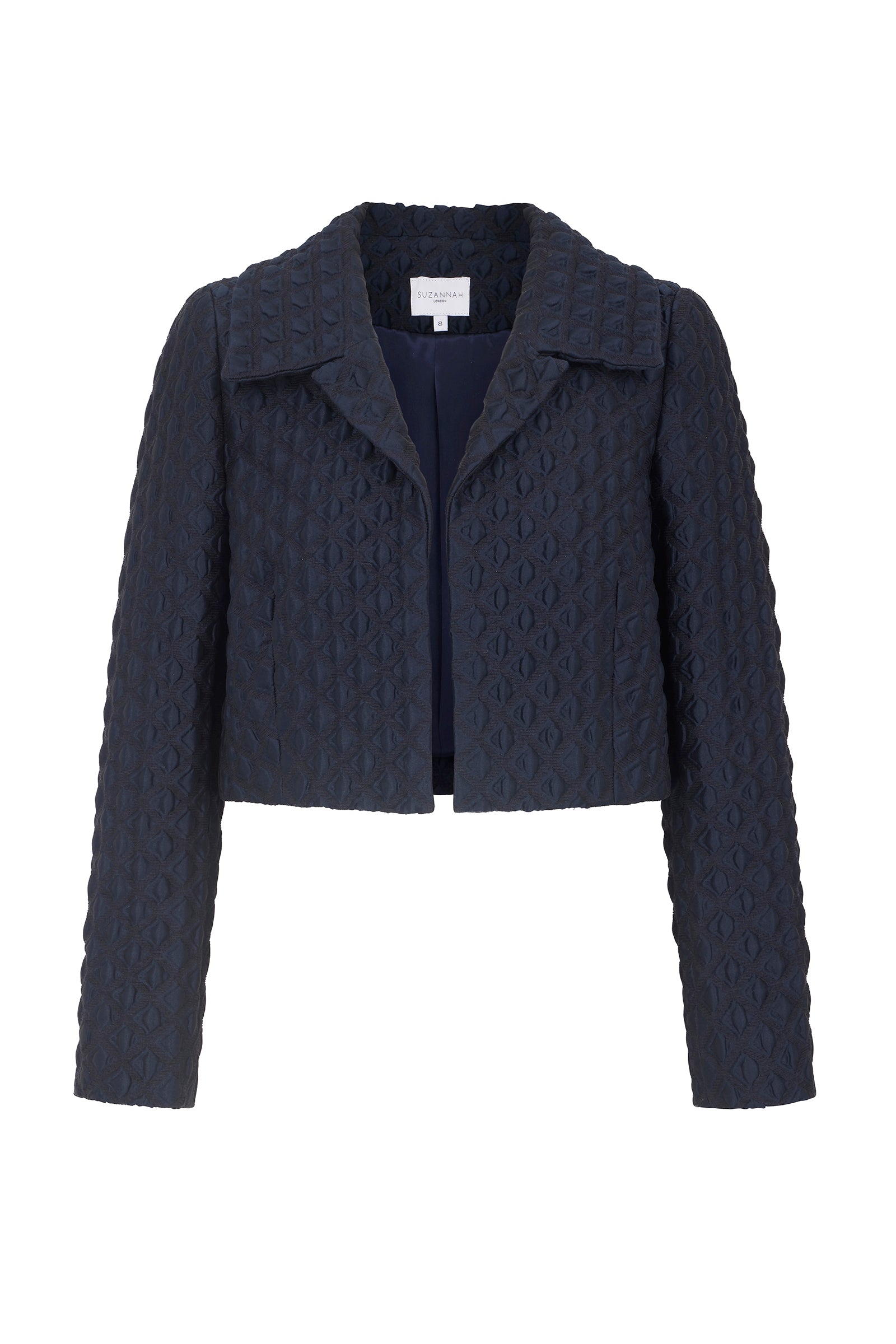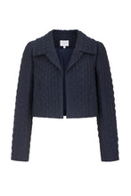 The Remy Cropped Jacket is a best-selling style. A very dark navy blue, this neat cropped jacket is cut from a beautiful raised cloqué of textural diamonds.