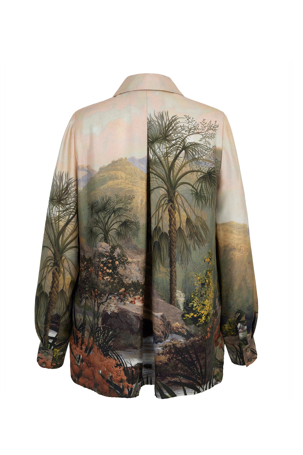 A classic button-through silk twill shirt with an all over dream landscape print designed and created by Suzannah and the textile team.The beautiful print design...