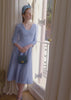 The Arlena Dress is a beautiful adaptation of our best selling fit and flare silhouette, with an ultra-flattering curved V-neck, cut from a high quality Italian stretch cloqué in a beautiful mid blue hue.
