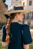 A sustainable addition to the Suzannah collection, which has been styled with the sensational Delphine Dress in Navy Cloqué