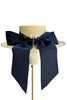 The boater is trimmed with a wide navy gros grain ribbon bow, with tails that fall down to the nape of the neck. The bow is finished with a stunning gold pin with pearl effect detailing, all of which is hand sewn in the milliners UK atelier.