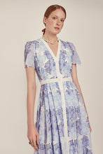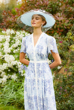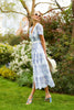 Chelsea is a stunning shirt dress constructed from intricately embroidered Italian chiffon in soft blues, onto a fresh white base. The contrasting white waist panel...