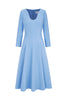 The Arlena Dress is a beautiful adaptation of our best selling fit and flare silhouette, with an ultra-flattering curved V-neck, cut from a high quality Italian stretch cloqué in a beautiful mid blue hue.