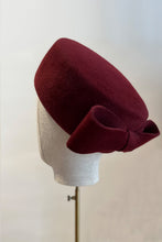 A classic Pillbox shape, hand blocked in rich Claret felt, with beautiful bow detail at the back.