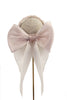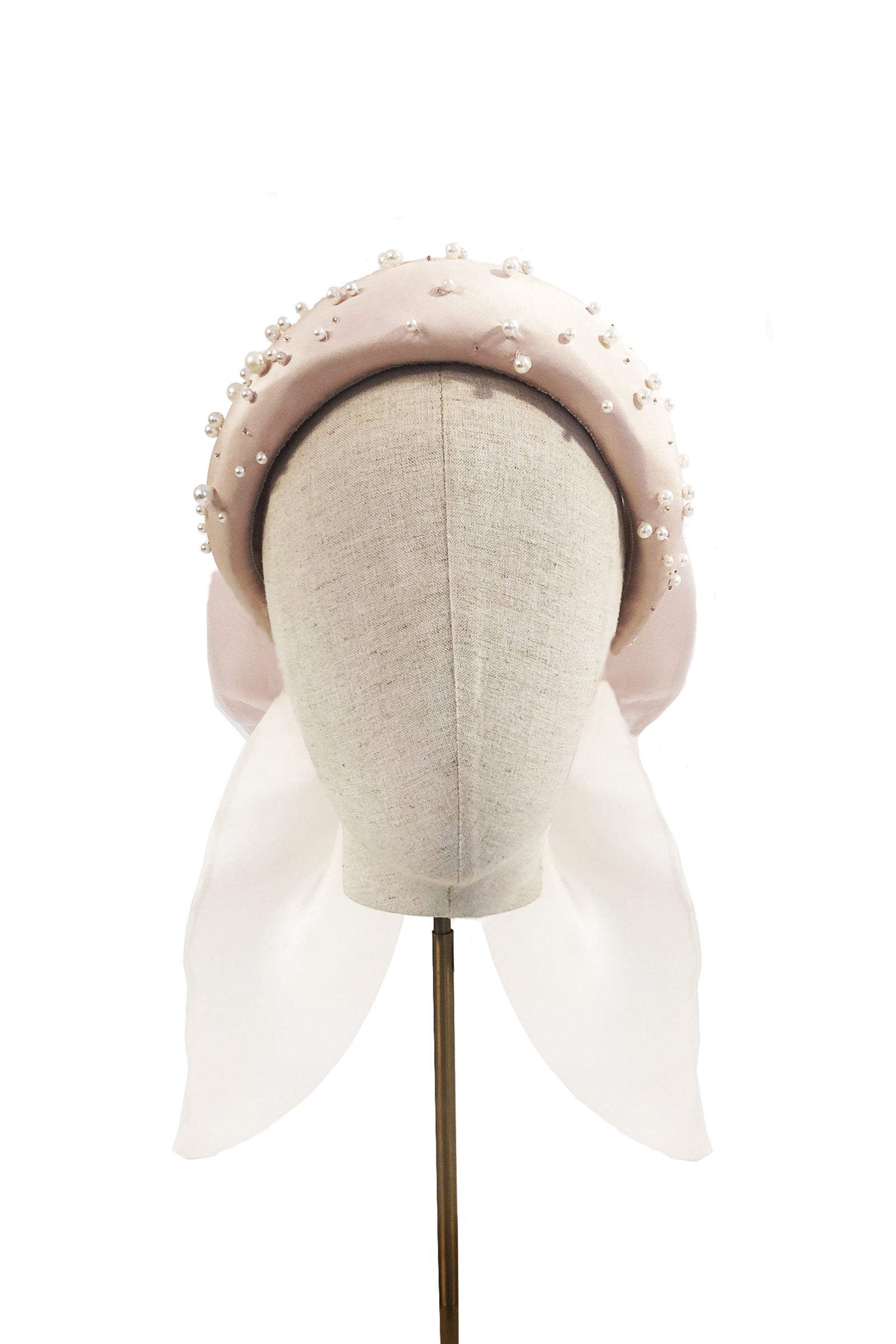 A stunning millinery collaboration between Suzannah London and John Boyd Hats, the Pearl Silk Halo is handmade using a 1930's hat block from the John Boyd archive. The pretty and unique curved halo is covered in soft pink pure silk taffeta with hand-beaded glass pearl details and a full soft organza bow at the back.