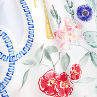 Suzannah worked together with the illustrator Susannah Garrod, who painted the inspiration that Suzannah photographed from the resort. Parrots, Palm Fronds, Striped Parasols, and beyond, were all painted with the illustrators coveted fine handwork and then worked into this absolutely beautiful white based print.
