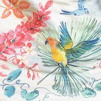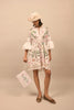 Suzannah worked together with the illustrator Susannah Garrod, who painted the inspiration that Suzannah photographed from her own holiday at the resort. Parrots, Palm Fronds, Striped Parasols, and beyond, were all painted with the illustrators coveted fine handwork and then Suzannah and her team created this incredible digitally printed textile design and produced this absolutely beautiful white kaftan dress.