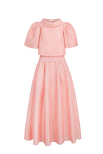 The Clara skirt and top set is beautifully cut, crafted from a delicious light to mid weight blush pink Italian cloth. The cloth has a raised texture in a pretty geometric design.