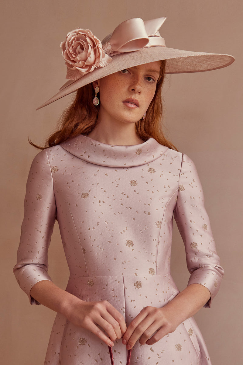 The dress is made from a beautiful French lace in a delicate blush pink colourway with internal corsetry for support and fit.