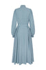 A neat stand up collar frames the face, and a detachable neck tie can be tied in a chic bow around the neck, or alternatively used as a tie belt to define the waist. The dress is finished off with self covered buttons and buckle belt.