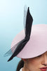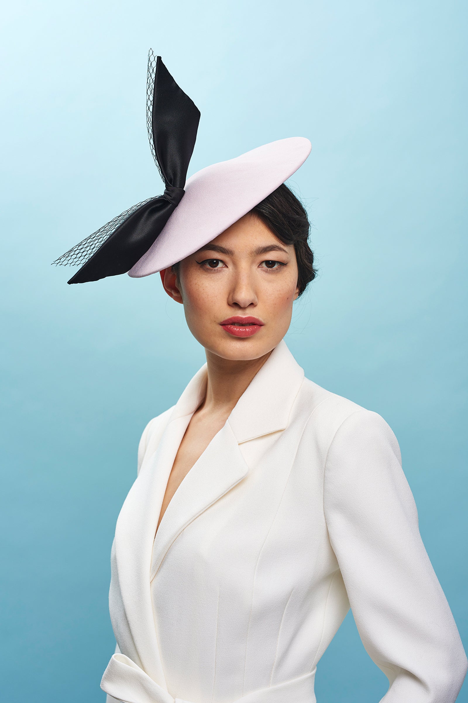 This beautiful hat has a dusty pink crepe fabric-covered sinamay slice with an angular black satin bow
