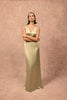 The modern column silhouette is enhanced with a fluid godet detail at the back, creating a beautiful movement to the gown.