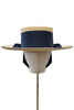 The boater is trimmed with a wide navy gros grain ribbon bow, with tails that fall down to the nape of the neck. The bow is finished with a stunning gold pin with pearl effect detailing, all of which is hand sewn in the milliners UK atelier.